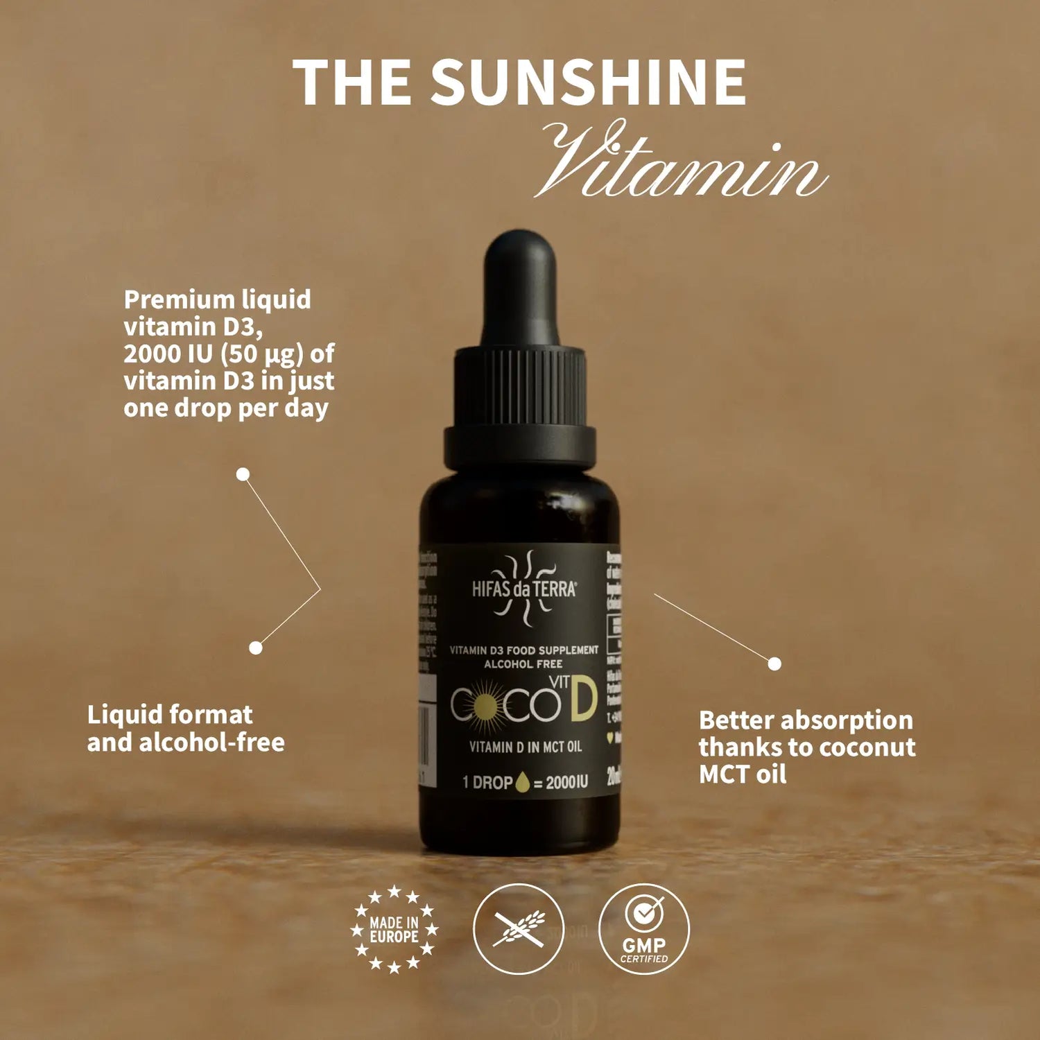 Liquid format 20 mL (alcohol-free): medium-chain fatty acids (MCT oil extracted from coconut oil); vitamin D3 (cholecalciferol); antioxidant (alpha-tocopherol).