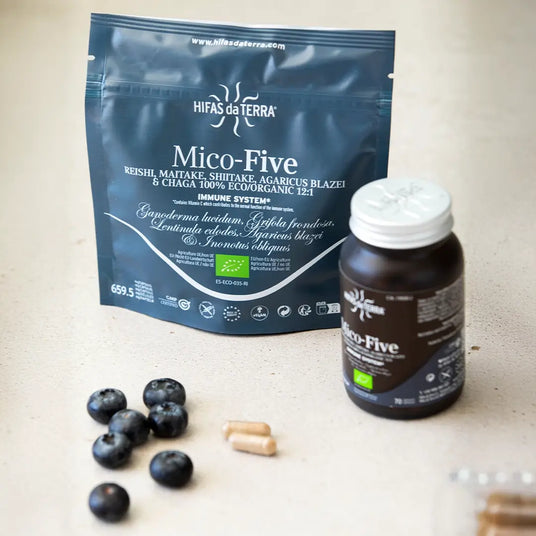 Mico-Five It is a combination of Reishi (Ganoderma lucidum), Shiitake (Edodes lentinula), Maitake (Frondosa tap), Sun mushroom (Agaricus Blazei) and Chaga (Inonotus obliquus), all of ecological cultivation. Mico-Five It is not made with mycelium, it only contains the richest part in bioactive substances of each species. This formula stands out for the power of synergy, which is more than the sum of the parts. In this case, it provides a large amount and variety of bioactive substances, especially beta-glucans, selected by their activity on the immune system. Discover the Superior quality combined with transparency and experience of Hifas da Terra.
