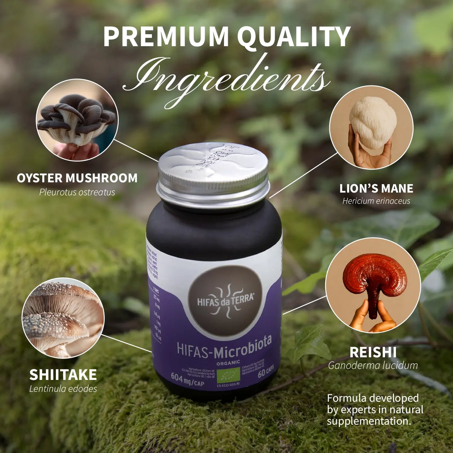 The HIFAS-Microbiota product contains the bioactive substances of the medicinal mushrooms Reishi, Lion's Mane, Pleurotus and Shiitake. Among them are ß-(1-3),(1-6) D-glucans and α-glucans, Triterpenoids, Ganoderic Acid, Linolenic Acid, Hericenones and Ergosterol (Vitamin D2 precursor).