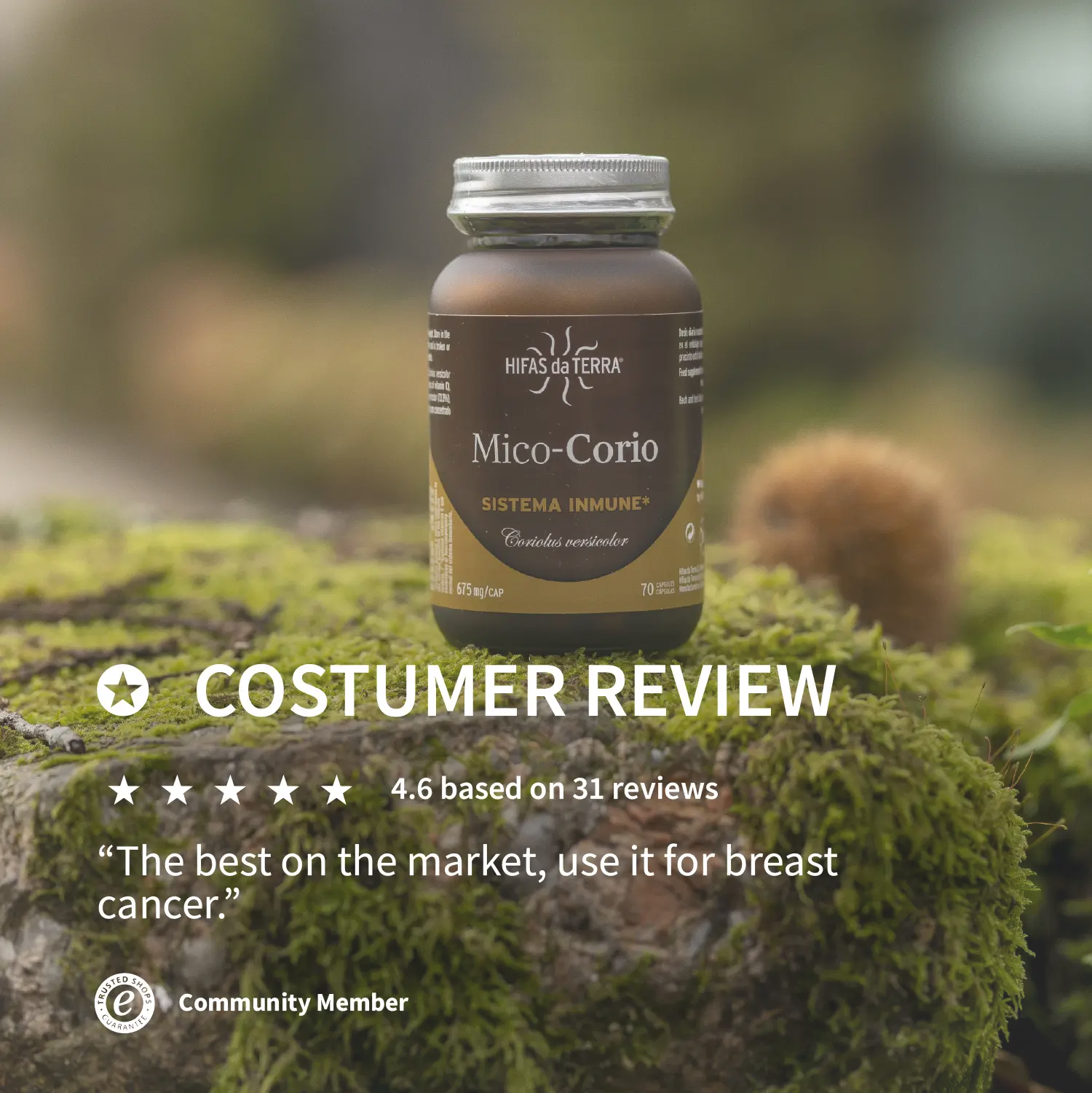 FORMAT Glass container with 70 capsules.PRODUCT DESCRIPTION Food supplement containing 675 mg of pure, standardised extract of turkey tail mushroom (Coriolus versicolor) from Hifas da Terra, selected from unique strains with the highest analytical quality. Mico-Corio contains only pure extract from the fruiting body of Coriolus versicolor, offering the most concentrated form of this mushroom available on the market.INGREDIENTS 495 mg of fruiting body extract of Coriolus versicolor (73.33%), vegetable capsule (purified water, concentrated purple carrot juice), and acerola (Malpighia glabra).